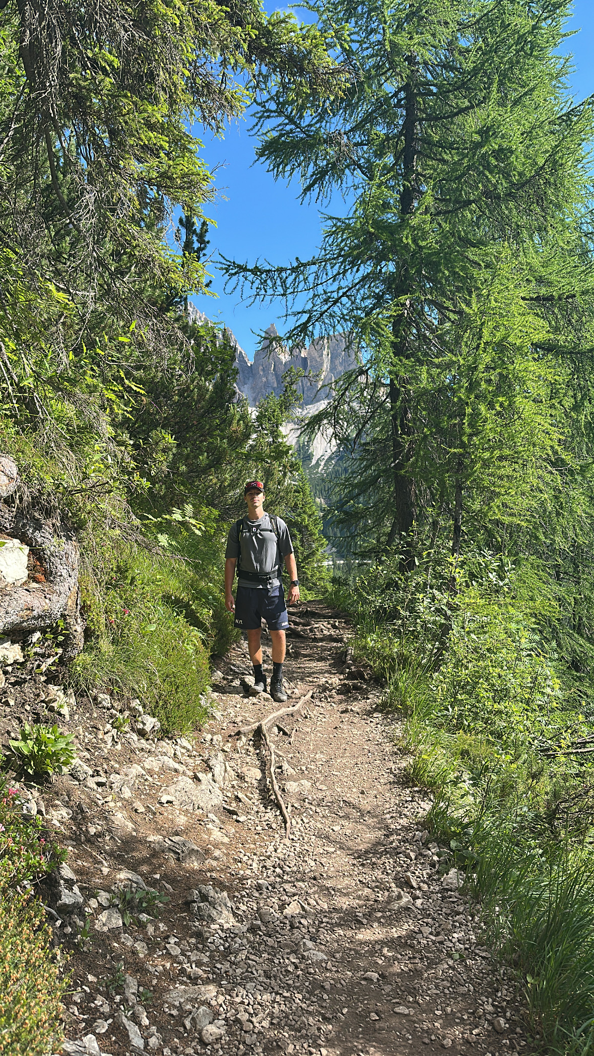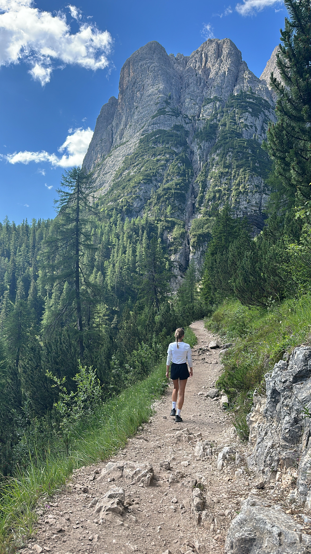 Die Wanderung zum Lago di Sorapis beginnt am Passo Tre Croci und führt über den markierten Weg Nr. 215 in Richtung Rifugio Vandelli. Der Einstieg ist einfach und verläuft zunächst breit und weitgehend flach durch Wald und offenes Gelände. Der Weg ist relativ gut ausgebaut und bietet erste Blicke auf die umliegenden Felsformationen der Dolomiten. Nach einem Geröllfeld und einem kleinen Wasserfall wird der Pfad schmaler und der Untergrund steiniger. Der Weg steigt nun kontinuierlich an und führt näher an die Felswände heran. In diesem Abschnitt ist mehr Aufmerksamkeit nötig, da sich lose Steine und schmale Passagen häufen. Das Gelände wirkt insgesamt alpiner, bleibt aber gut nachvollziehbar markiert.