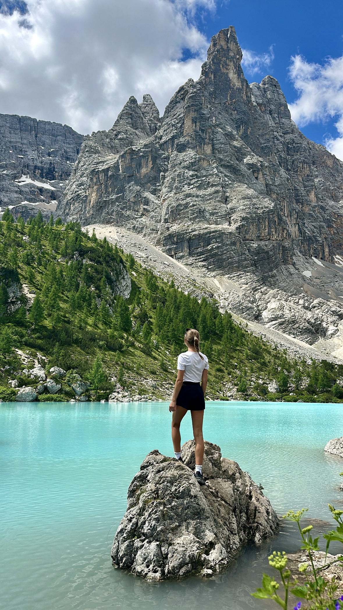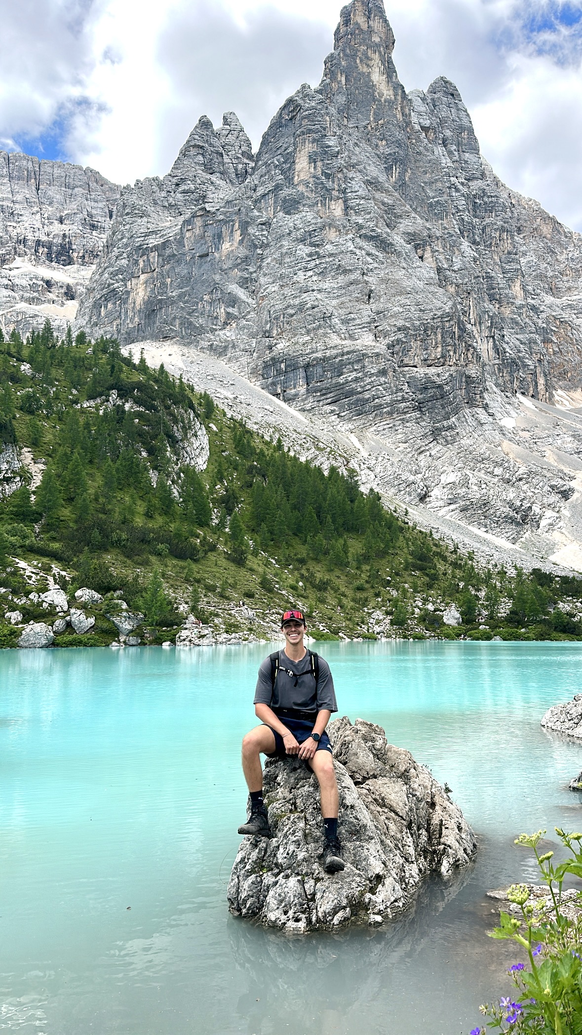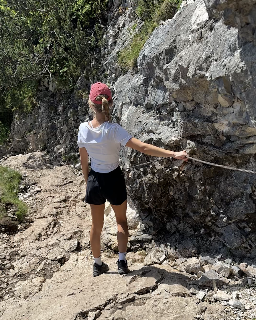 Es folgen mehrere felsige Abschnitte mit kurzen, ausgesetzten Stellen. Diese sind mit Drahtseilen, Eisenstufen und Metallgittern gesichert. Trittsicherheit, Schwindelfreiheit und festes Schuhwerk sind hier wichtig. Mit vorsichtigem Gehen sind diese Stellen auch für weniger erfahrene Wanderer machbar. Der Weg verläuft anschließend weiter in Richtung Rifugio Vandelli. Von der Hütte aus sind es nur noch wenige Schritte bis zum See. Der Lago di Sorapis liegt ruhig zwischen steilen Felswänden und fällt durch seine türkisfarbene Wasserfarbe auf. Die gesamte Strecke ist als mittelschwer einzustufen und dauert etwa 4-5 Stunden bei rund 400 Höhenmetern. Wir konnten nicht glauben, dass die Farbe tatsächlich so malerisch aussah wie auf den Bildern, bis wir selbst dort waren. Am See selbst haben wir eine Pause eingelegt und die Aussicht genossen, denn Baden ist dort verboten. Anschließend haben wir noch einen Stopp in der Hütte eingelegt, bevor wir uns auf den Rückweg gemacht haben.