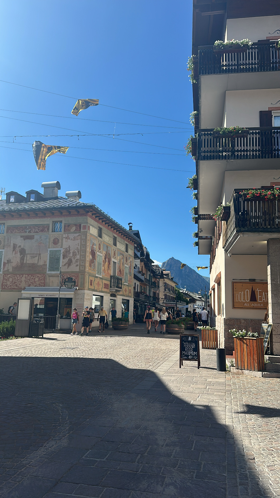Nach der Wanderung kannst du den Tag in Cortina d’Ampezzo ausklingen lassen. Wir waren Ende Juni da, zu der Zeit als gerade einer der Ultramarathons dort war. Diesen Zeitpunkt können wir allerdings nicht empfehlen. Viele Hotels waren ausgebucht und deutlich teurer als sonst, die Stadt war teilweise gesperrt und überfüllt und auch auf den Wanderwegen bist du immer wieder Läufern begegnet. In Summe war einfach sehr viel los und wir denken, dass es bessere Zeitpunkte gibt, die Dolomiten zu besuchen. Unser Tipp daher: informiere dich vorher auf der Lavaredo Ultra Trail Seite über Termine und plane, wenn möglich, drum rum.
