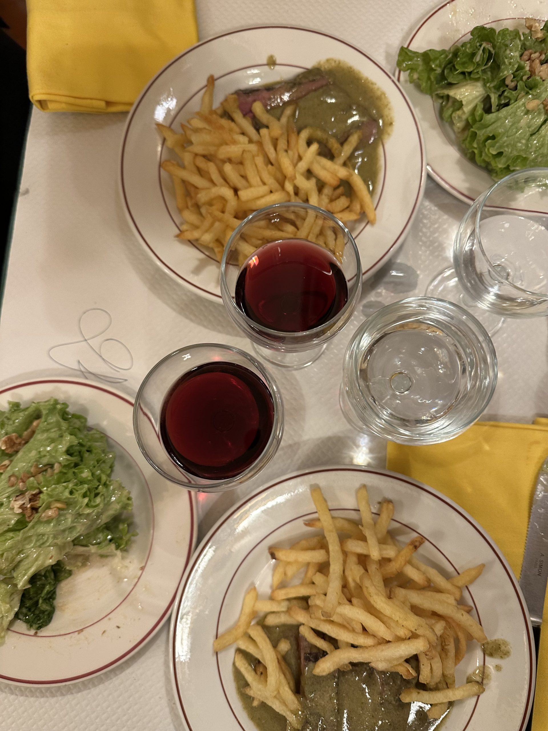 Nach dem Louvre ging es für uns fußläufig zu einer der bekanntesten Restaurantketten in Paris: Le Relais de l’Entrecôte. Das Konzept dort ist einzigartig: Es gibt nur ein Gericht, bestehend aus Salat, Pommes und Steak und es gibt keine Reservierung. Klingt erstmal nach Massenabfertigung? Definitiv, aber das Essen sowie das Konzept überzeugen dennoch und ziehen extrem viele Leute an. Wir wussten, dass es voll wird und man früh genug da sein muss, jedoch nicht wie voll.