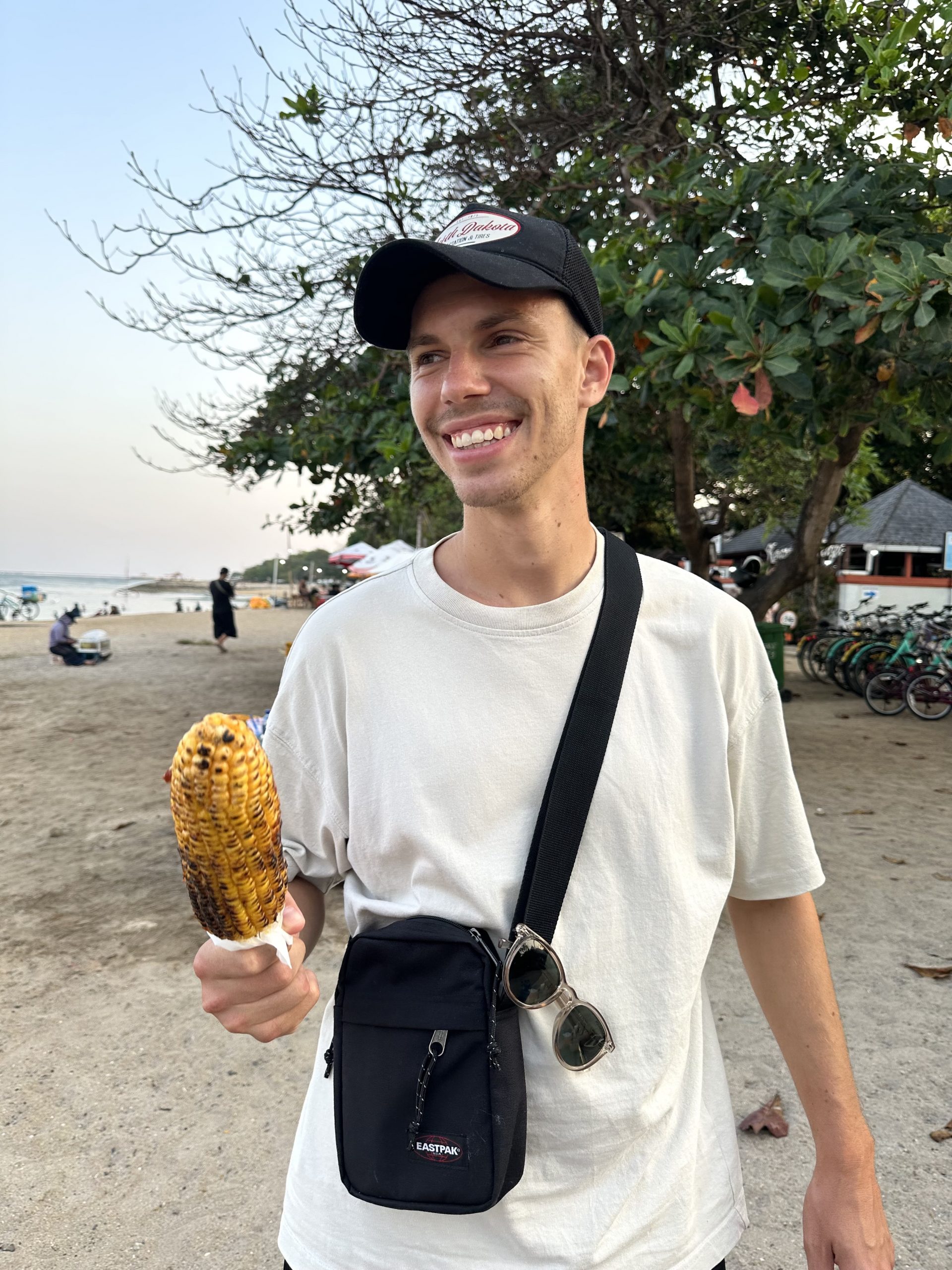 Hier noch ein kleiner Hinweis für dich. Am Strand von Sanur gibt es ein paar Stände, an denen gegrillte Maiskolben mit Butter und Chili verkauft werden. Nico konnte nicht widerstehen und lag schon am nächsten Tag mit Bali Belly flach. Wenn du das vermeiden möchtest, solltest du unbedingt die geschmolzene Butter weglassen oder so wie Michaela deinen Magen im Vorfeld mit Probiotika darauf vorbereiten.
